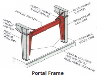 Portal Frames are used in exterior sidewalls or between the interior columns of Multi Span / Multi Gable buildings when diagonal bracing is not allowed because of a requirement for clear unobstructed space. Portal frames are made from built-up columns and beams. Their columns flanges are stitch bolted to the webs of the rigid frame columns and extend down to 150 mm above F.F.L. care must be taken to ensure that the bottom of the portal frame beam is higher than the required unobstructed height.